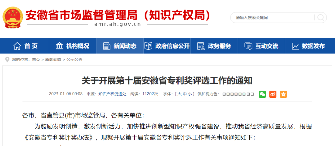 1月6日,安徽省市場監(jiān)督管理局發(fā)布了關(guān)于開展第十屆安徽省專利獎評選工作的通知,關(guān)于申報時間:2023年1月6日-2月28日,推薦時間:2023年3月1日-3月15日,逾期不予受理;申報條件和申報程序如下: