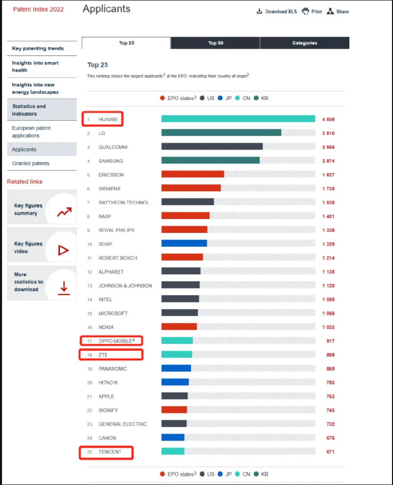 # 中國成歐洲專利申請?jiān)鲩L最快國家,華為OPPO連續(xù)三年排名前二十五