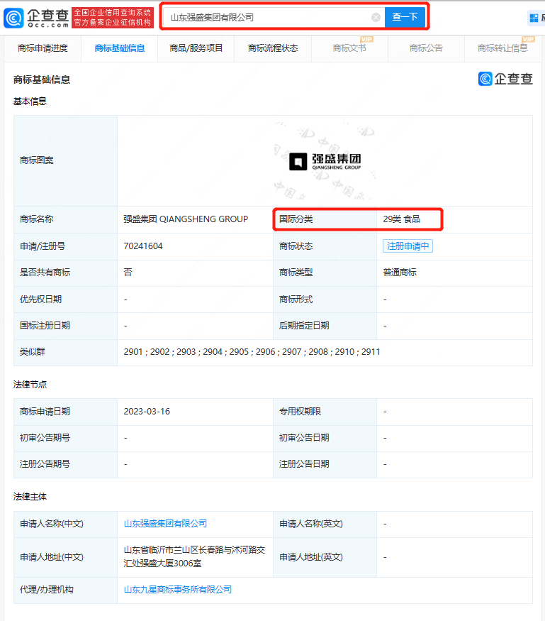 # 孫紅雷的強(qiáng)盛集團(tuán)申請魚肉食品商標(biāo)