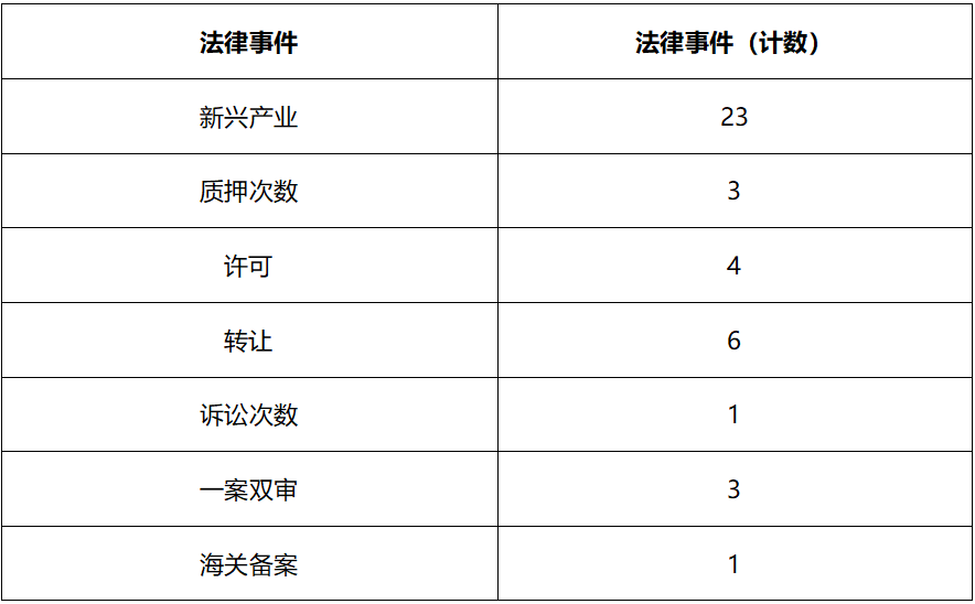 從法律事件分析,共計(jì)有36項(xiàng)專利屬于新興產(chǎn)業(yè),其中6項(xiàng)進(jìn)行過質(zhì)押,有7項(xiàng)進(jìn)行過專利許可,有7項(xiàng)經(jīng)歷過轉(zhuǎn)讓。具體詳情如下: