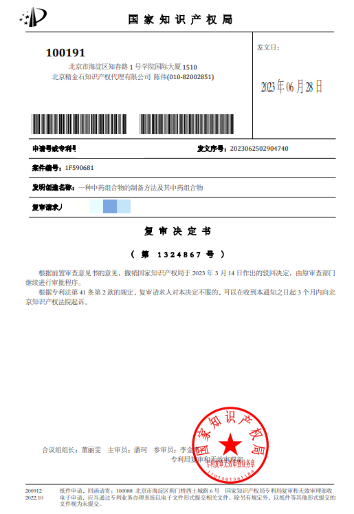 由于補全了證據(jù)鏈條,對“一部分采用水提,一部分采用乙醇提取,效果優(yōu)于單純水提或醇提其效果是合理預期的”進行了有效答復,審查意見前置撤駁,很快獲得了專利權。