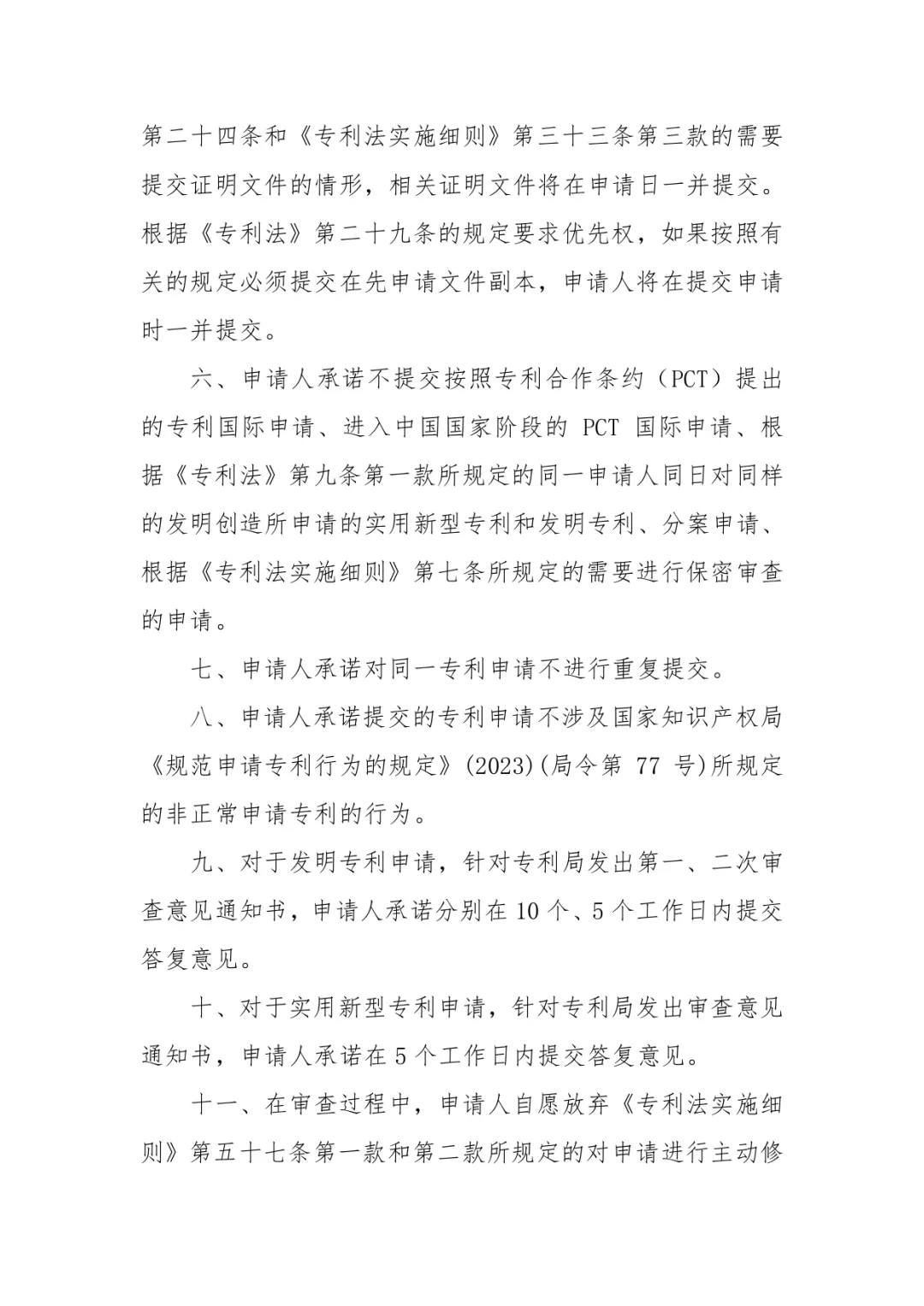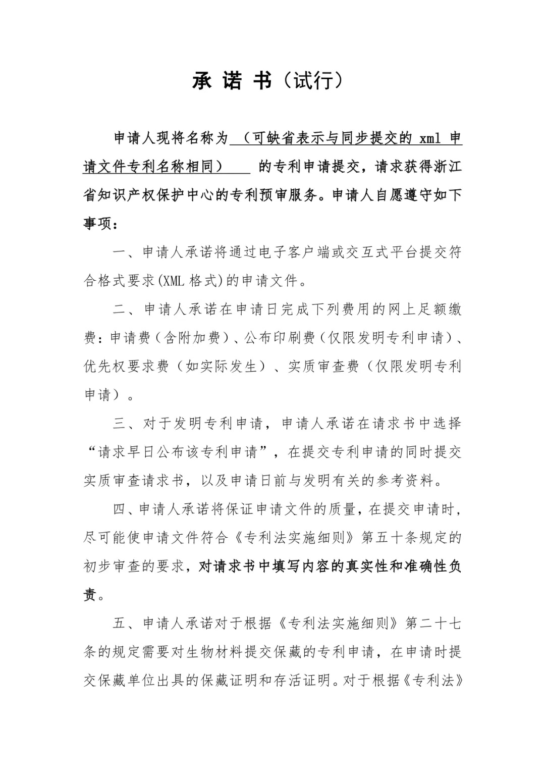 1、預(yù)審申請材料必傳項中取消《專利申請快速預(yù)審服務(wù)申請表》,不再提交該表。2、身份證復(fù)印件、總委編號回執(zhí)、自檢表由必傳項變?yōu)檫x傳項,不要求提交該些材料,請申請人自行做好相關(guān)內(nèi)容檢查。3、修改《承諾書》部分內(nèi)容,可缺省發(fā)明名稱,不同預(yù)審案件可提交相同的《承諾書》蓋章件。新《承諾書》見文末附件,或可在官網(wǎng)下載專區(qū)常用表格處下載。(1)申請人為多個時,須提交合作研發(fā)聲明。(2)以前沒有向浙江中心提交過的新總委編號,建議提交總委編號回執(zhí)。