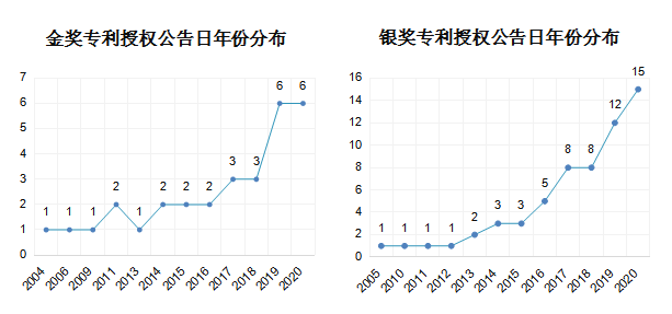 本屆金銀獎(jiǎng)獲獎(jiǎng)項(xiàng)目專利申請(qǐng)日年份在2002-2020年間,主要集中在2013-2018年。