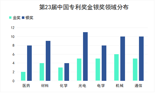 本屆專利獎(jiǎng)中金獎(jiǎng)和銀獎(jiǎng)獲獎(jiǎng)專利所屬領(lǐng)域圖中可看出:
