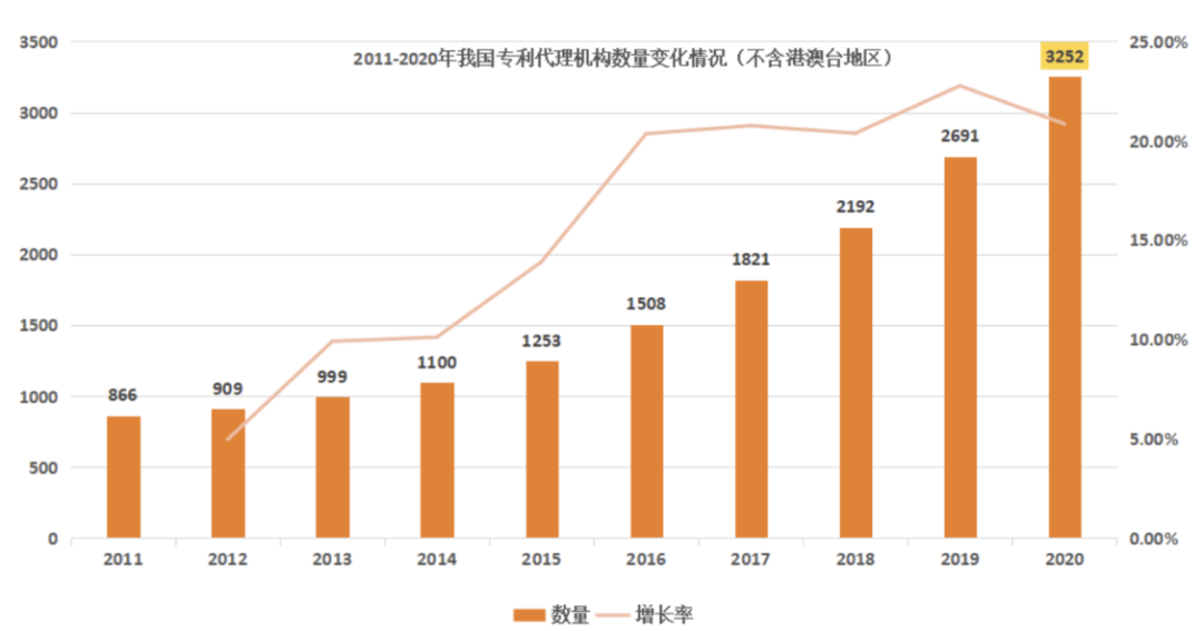 以上為截止到2020年底的國(guó)內(nèi)專利代理機(jī)構(gòu)的數(shù)量及歷年增長(zhǎng)率,可以看出自2016年起每年的增長(zhǎng)率一直保持在20%以上。
