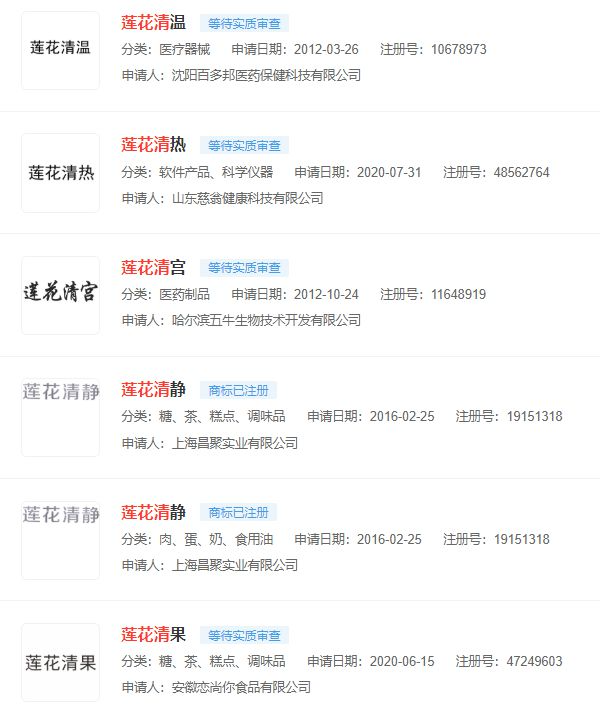 天眼查資料顯示,多個與“連花清瘟”近似的商標(biāo)被多家公司申請注冊,比如“連花清溫”、“連花清熱”、“連花清宮”、“連花清靜”等。