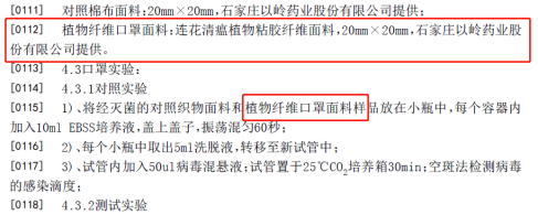 具體記載了,實驗采用植物纖維口罩面料,為石家莊以嶺藥業(yè)股份有限公司提供的花清瘟植物粘膠纖維面料,20mm× 20mm,但其并未明確記載試驗所采用的植物纖維口罩面料與前述含有連花清瘟提取物的紡粘無紡布之前的關(guān)系,是否為本發(fā)明實施例制備的含有連花清瘟提取物的紡粘無紡布,以及具體對應(yīng)哪個實施例制備的?