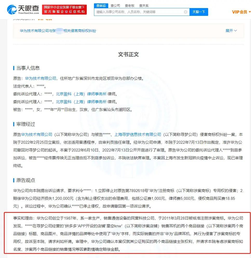 天眼查App顯示,近日,華為技術(shù)有限公司與張某某侵害商標(biāo)權(quán)糾紛一審文書公開。