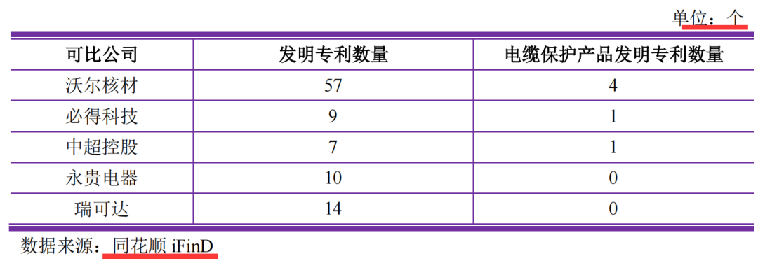 其他幾家可比公司的主營(yíng)業(yè)務(wù),并非電纜保護(hù)業(yè)務(wù),因此僅僅對(duì)比電纜保護(hù)的發(fā)明專(zhuān)利數(shù)量,是不妥的。
