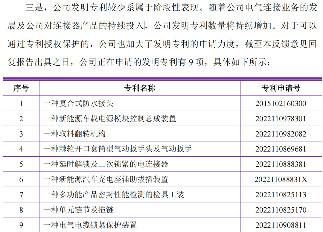 一方面,強(qiáng)調(diào)電氣保護(hù)業(yè)務(wù)不適合申請(qǐng)發(fā)明專(zhuān)利,部分產(chǎn)品結(jié)構(gòu)申請(qǐng)發(fā)明專(zhuān)利容易被反向研發(fā),但卻在證監(jiān)會(huì)的質(zhì)詢函之后,突然強(qiáng)調(diào)電氣連接業(yè)務(wù)隨著研發(fā)投入的增加,可以申請(qǐng)發(fā)明專(zhuān)利了,而且通過(guò)申請(qǐng)?zhí)柨梢暂^為明顯的看出,有為了應(yīng)對(duì)證監(jiān)會(huì)質(zhì)詢而突擊申請(qǐng)發(fā)明專(zhuān)利的嫌疑。