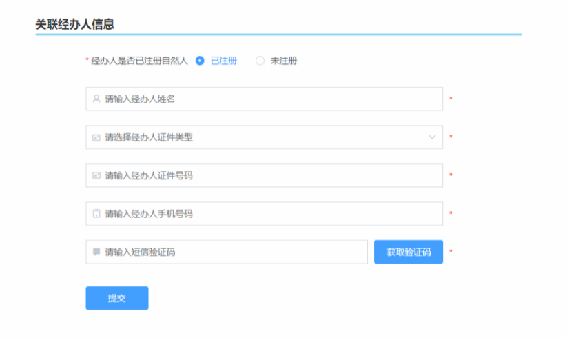 1)關(guān)聯(lián)已注冊的自然人為經(jīng)辦人,輸入相關(guān)信息短信驗證碼,驗證成功后提交完成關(guān)聯(lián)經(jīng)辦人。如圖: