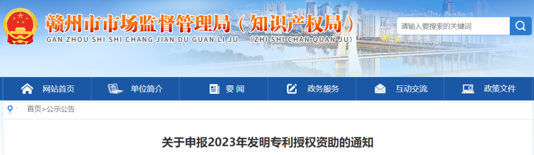 近日,贛州市市場監(jiān)督管理局發(fā)布了關(guān)于申報2023年發(fā)明專利授權(quán)資助的通知。通知中講到: