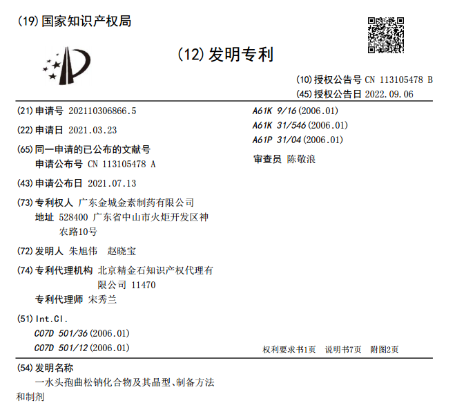 CN2021103068665:一水頭孢曲松鈉化合物及其晶型、制備方法和制劑。