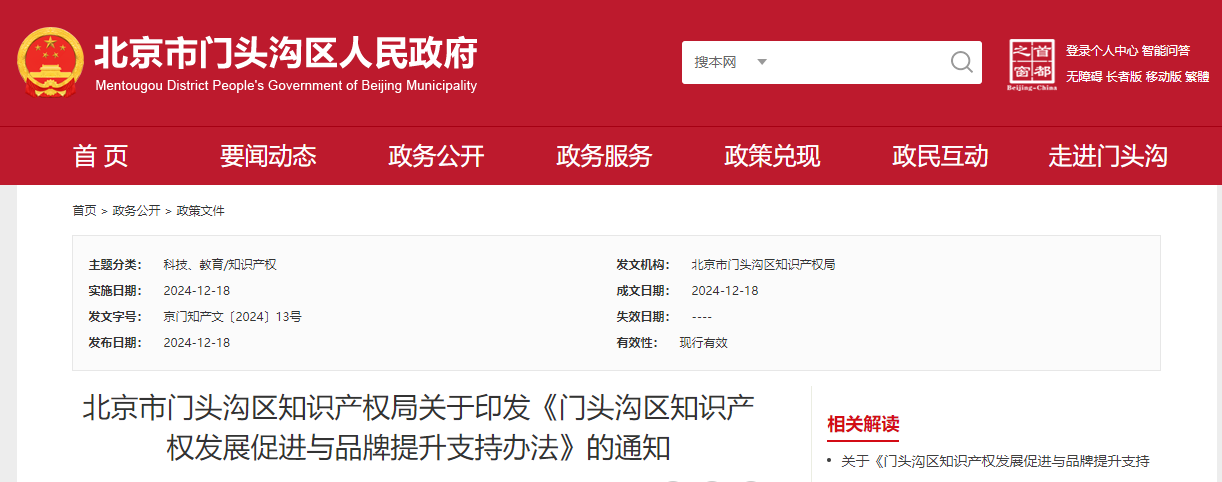 北京門頭溝區(qū)知識(shí)產(chǎn)權(quán)發(fā)展促進(jìn)與品牌提升支持辦法預(yù)申報(bào)工作的通知